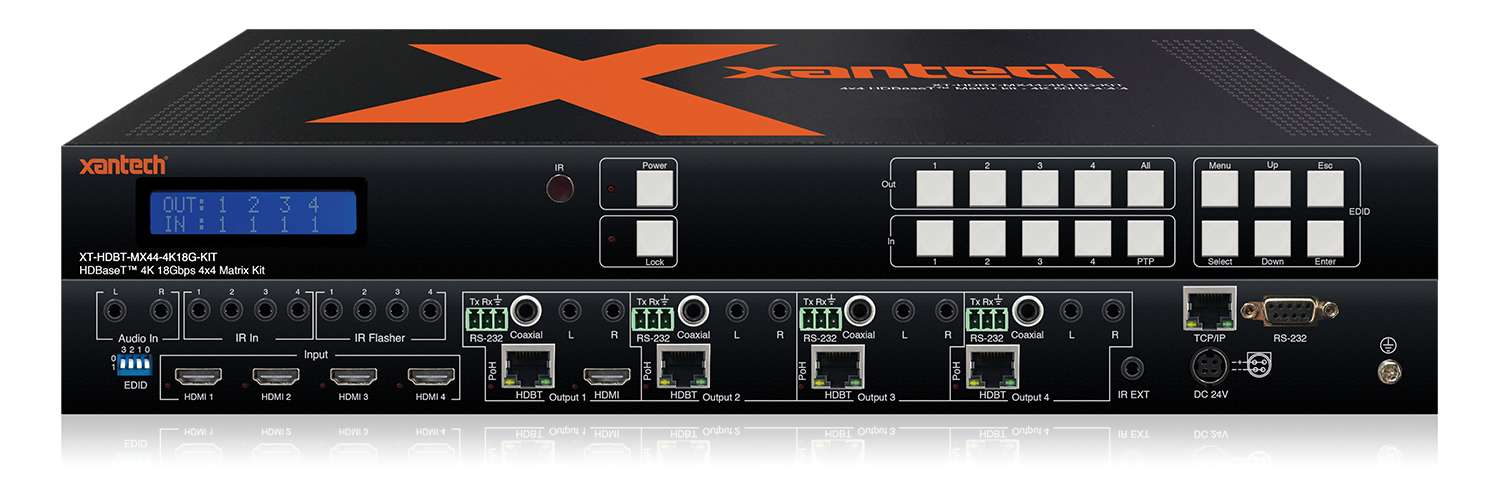 The XT-HDBT-MX44-4K18G-KIT 4x4 HDBaseT™ Matrix kit offers unprecedented performance and value for the custom installation market. The XT-HDBT-MX44-4K18G-KIT is a HDMI 2.0 4K 60Hz 4:4:4 HDCP 2.2 Matrix package utilizing CSC technology to deliver HDMI, Bi-directional IR, RS-232 and PoH (PoE) up to lengths of 70m over a single CAT cable. The Matrix also provides advanced features including simultaneous HDBaseT/HDMI on output 1, audio breakout with pre-amp variable line-level control and a web browser interface module for control and configuration of the matrix. The XT-HDBT-MX44-4K18G-KIT is supplied with 4x XT-HDBT-EX70-4K18G-RX receivers.Read More